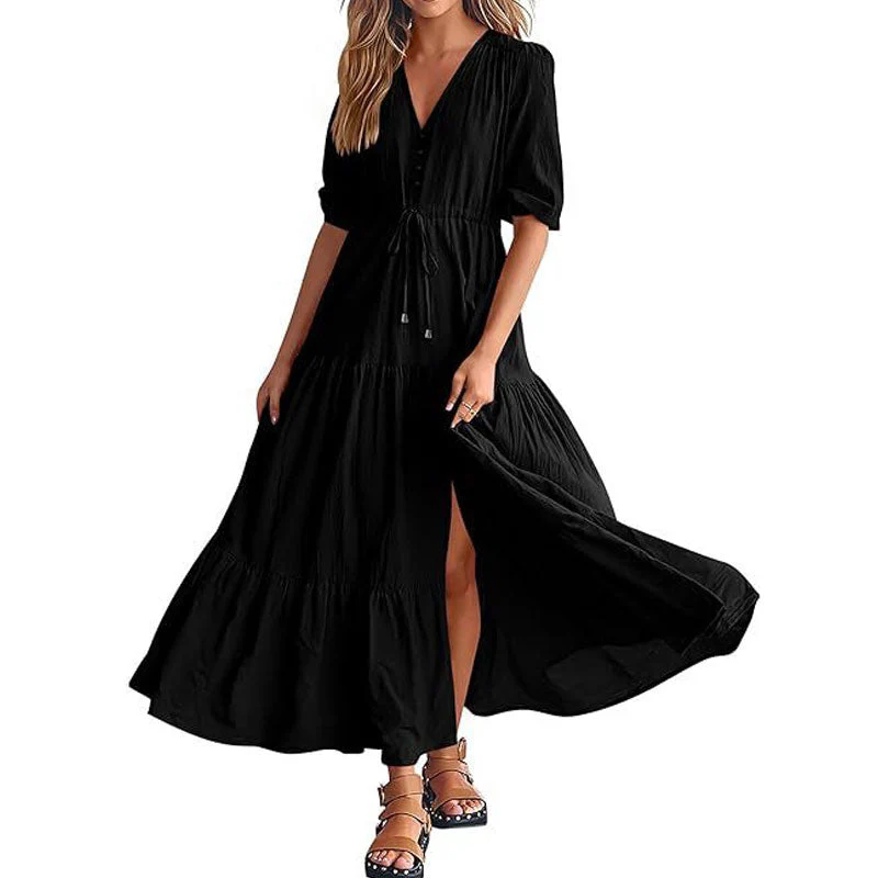 Solid Color Short Sleeves V Neck Button Drawstring Maxi Dresses